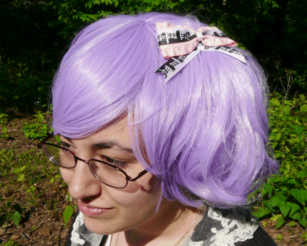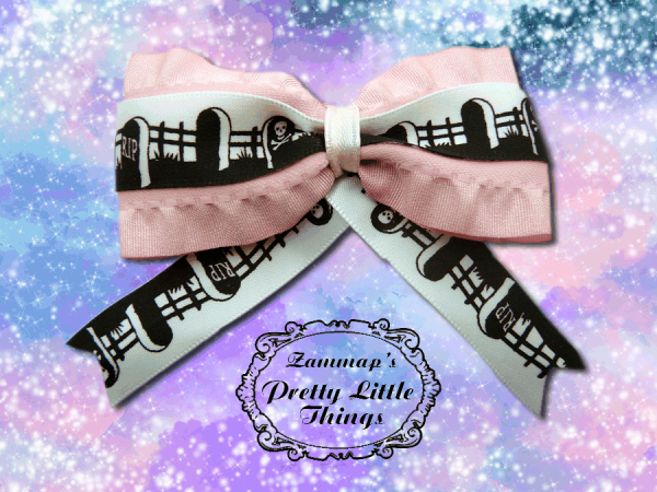 Creepy and cute tomb stone bow backed with ruffle ribbon. Stays in place with snap barrette.